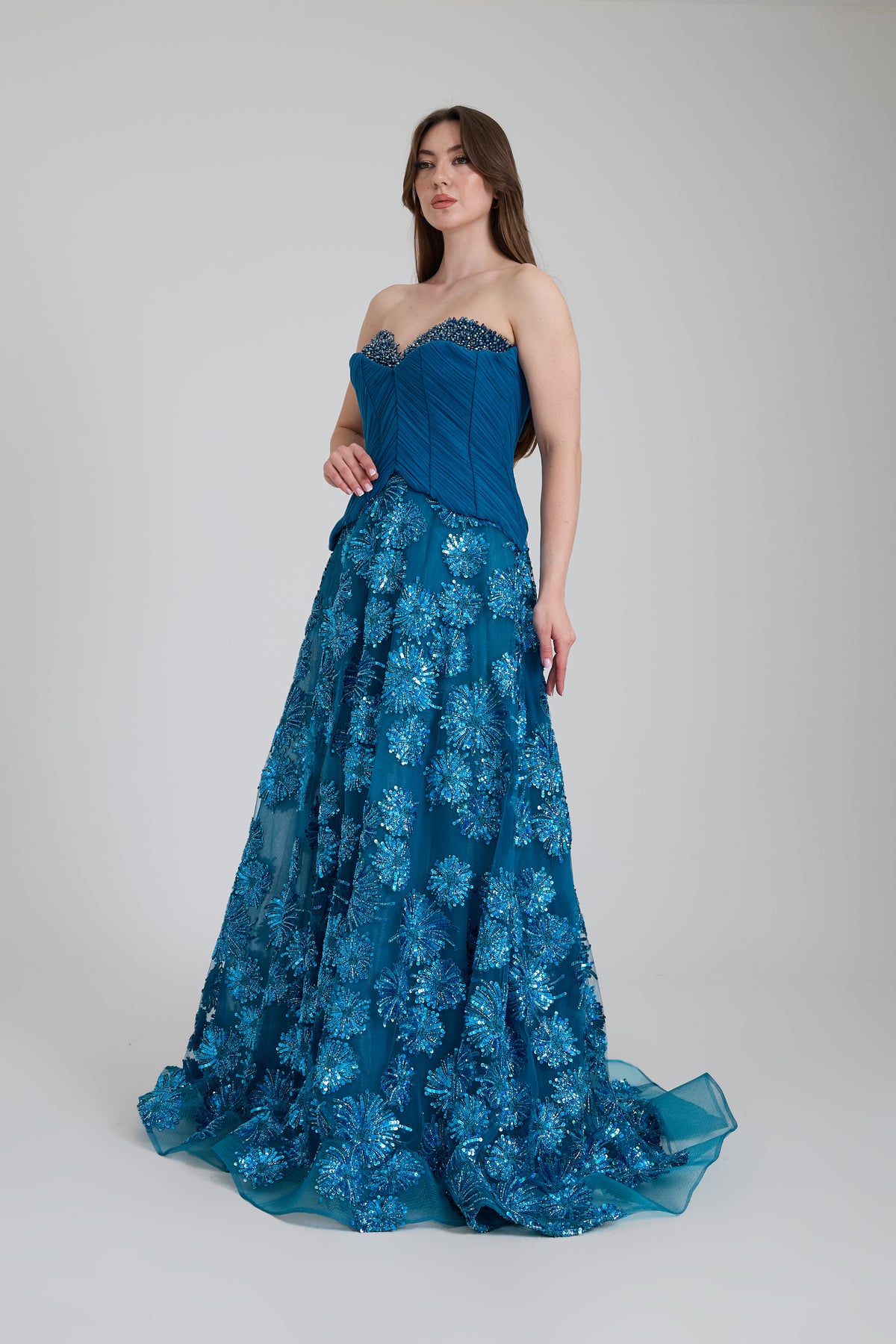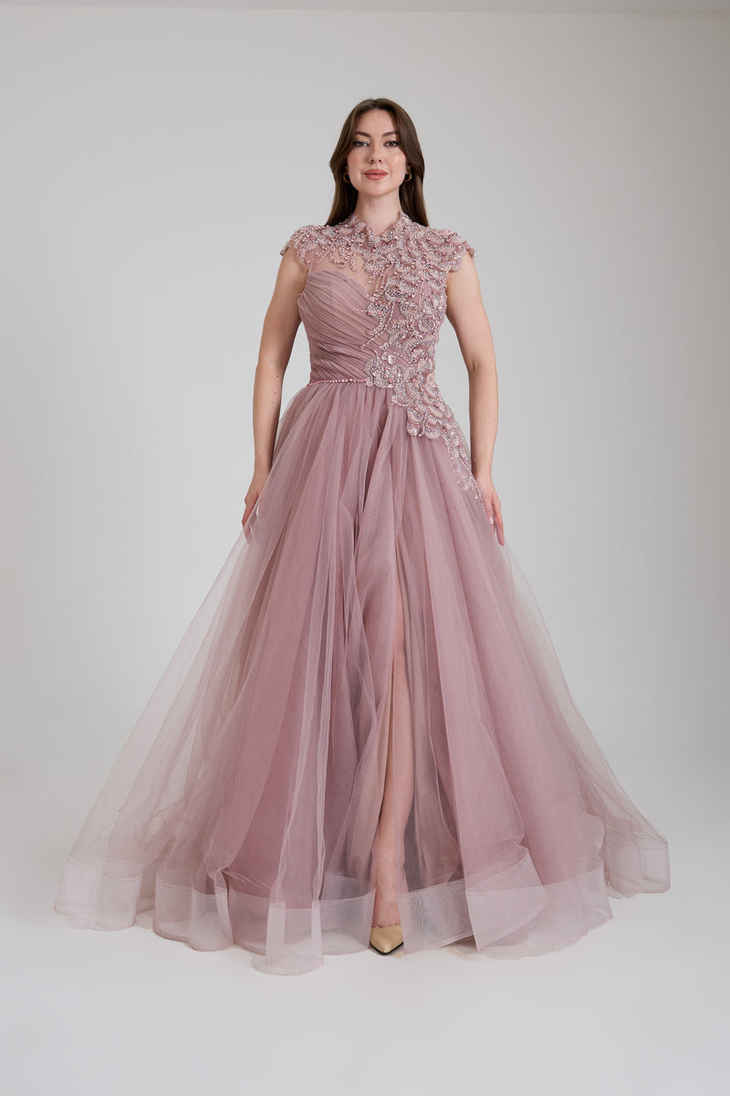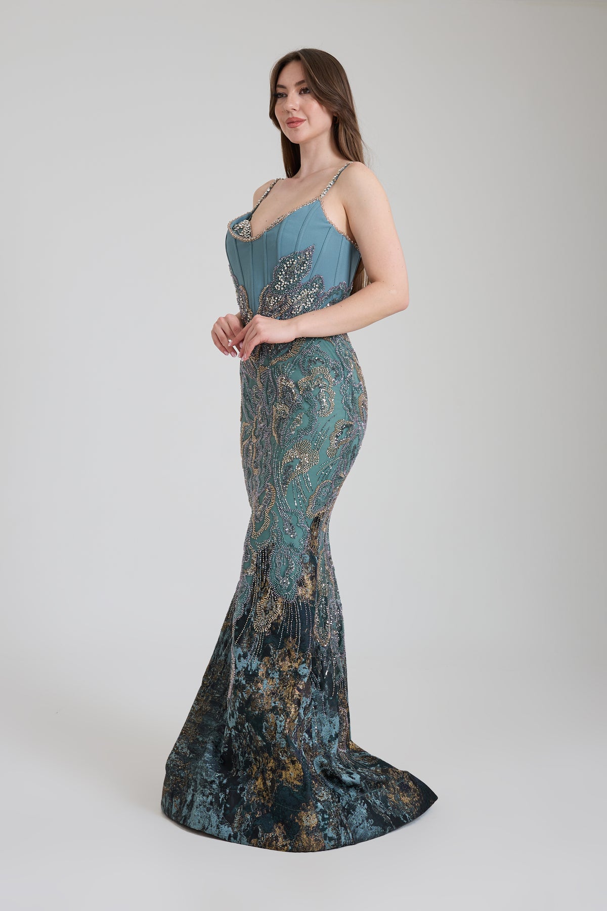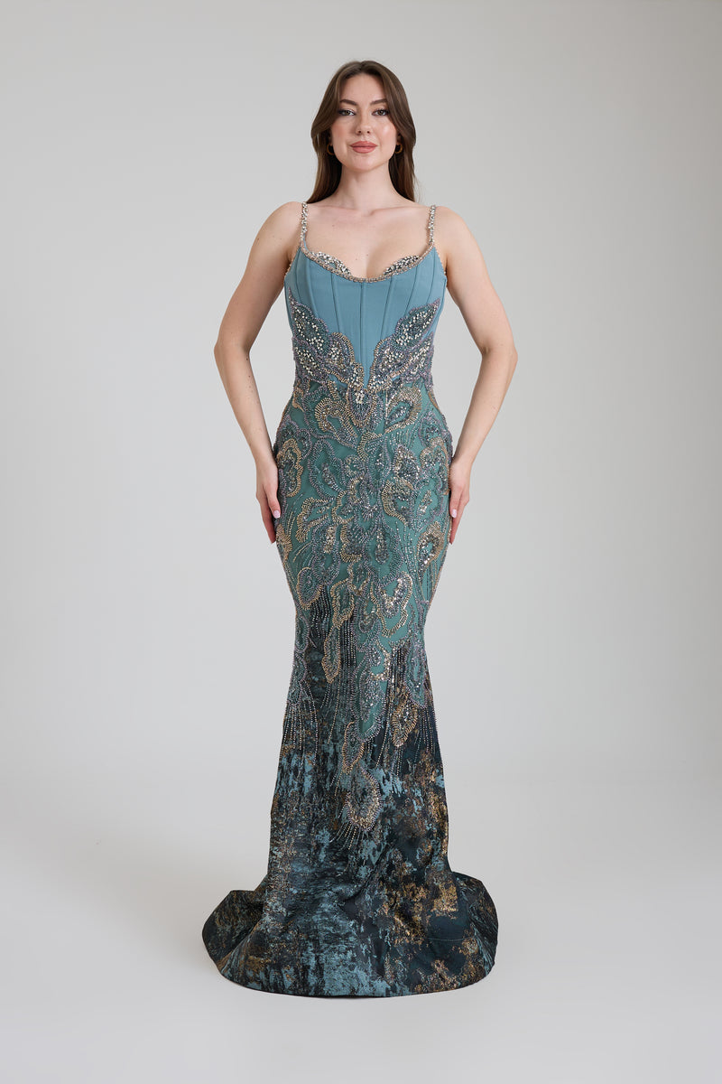 KADIN UZUN ABİYE KALP YAKA TRANSPARAN BALIK ABİYE ELBİSE