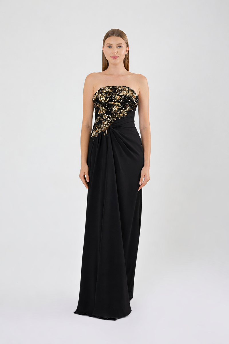 ASİMETREİK DRAPE DETAY UZUN ABİYE ŞIK ELBİSE