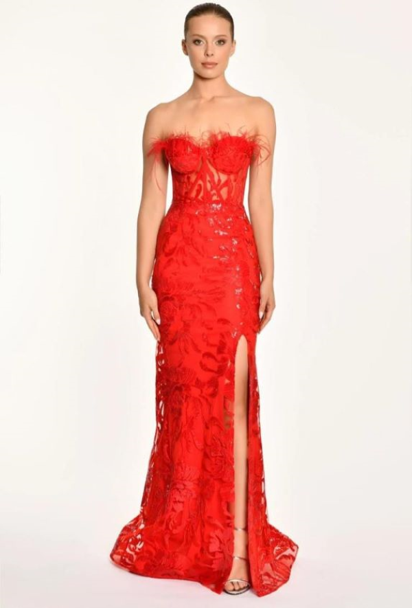 KADIN UZUN ABİYE STRAPLEZ OTRİŞLİ YIRTMAÇ DETAYLI ELBİSE