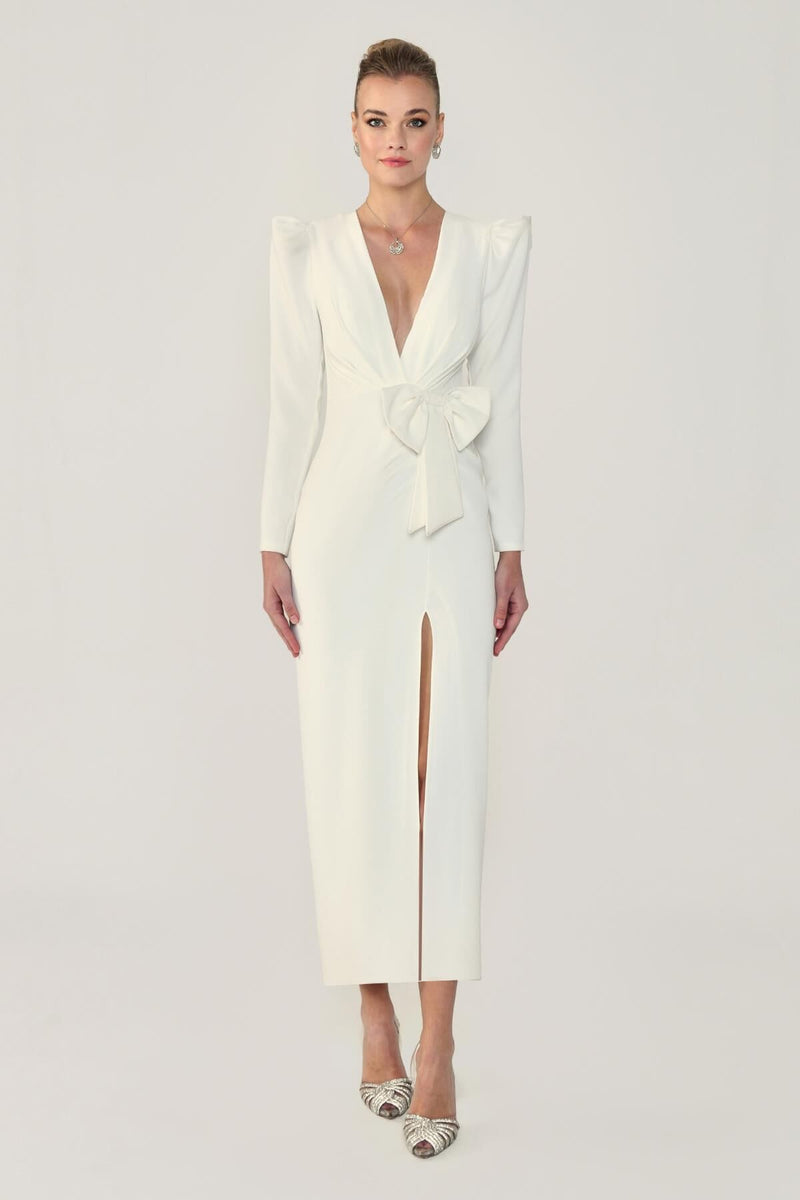 V YAKA FİYONK DETAYLI UZUN KOLLU MİDİ BOY YIRTMAÇLI ABİYE