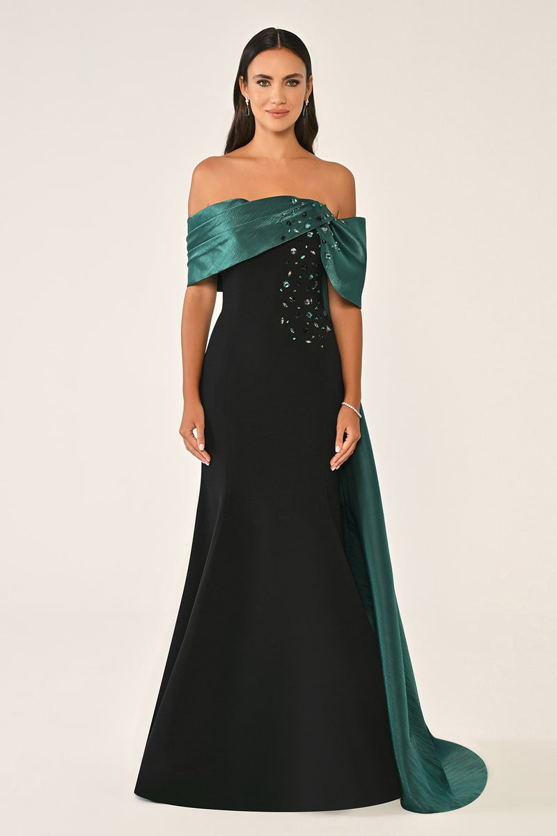 STRAPLEZ ÜSTÜ İŞLETMELİ KUYRUKLU KREP UZUN ABİYE ELBİSE