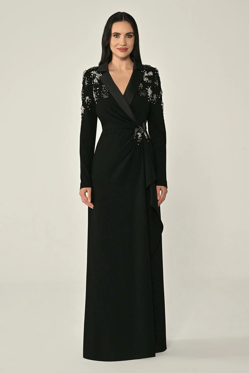 UZUN KOLLU ÜST AKSESUARLI SIRT DEKOLTELİ KREP UZUN ABİYE ELBİSE