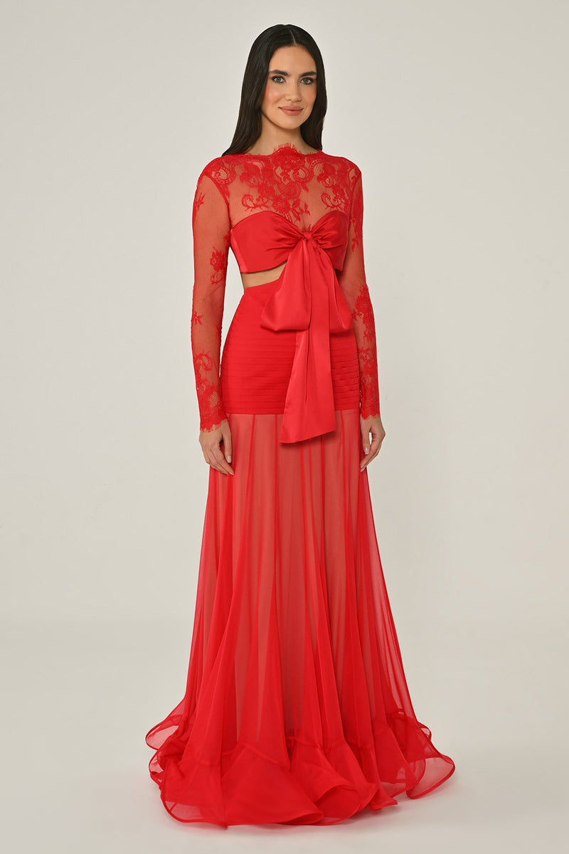 LEZ DANTEL SATEN BAGLAMALI TRANSPARAN ETEGİ ŞİFON UZUN ABİYE ELBİSE